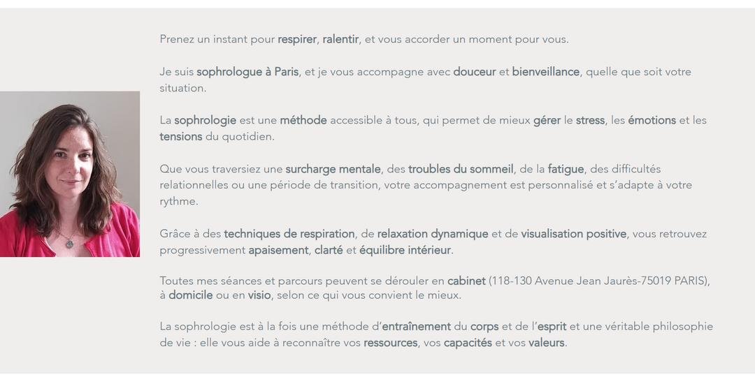 Sophrologue certifiée à Paris 19ᵉ, j’accompagne les personnes stressées, fatiguées ou en surcharge émotionnelle à retrouver calme, apaisement et équilibre intérieur. Grâce à des techniques de respiration, de relaxation guidée et de visualisation, mes séances aident à relâcher les tensions, améliorer le sommeil, gérer les émotions et retrouver de l’énergie au quotidien. 👉 Séances au cabinet, à domicile, en entreprise ou en ligne 👉 Accompagnement individuel, forfaits personnalisés + outils de pratique La sophrologie est un espace doux pour ralentir, se recentrer et se sentir mieux chaque jour. Première séance dédiée à vos objectifs bien-être. 🌿